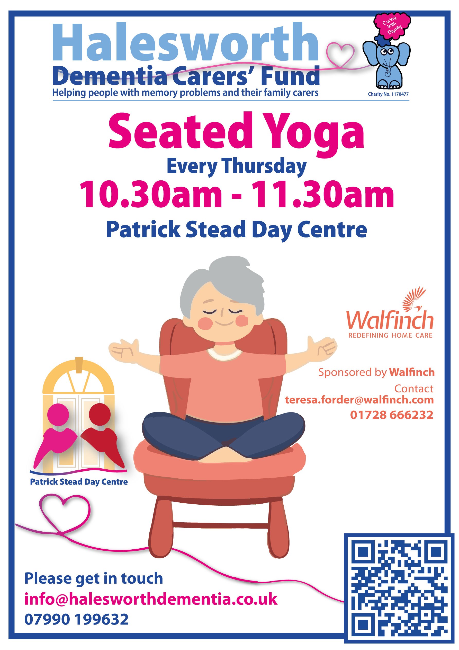 A new seated yoga class is starting on the 9th October from 10.30-11.30 in the Patrick Stead Day Centre. Sponsored by Walfinch, this is a great opportunity for anyone with memory issues and their carers to keep supple and enjoy some company.